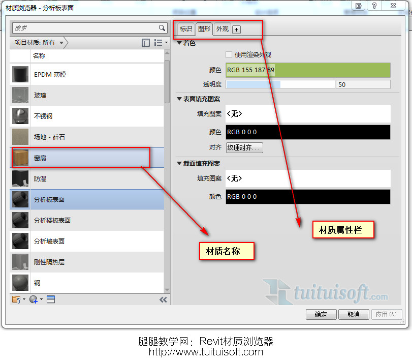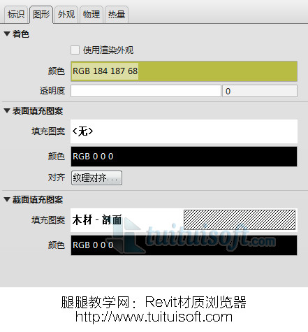 2、图形:用于设置材质在线框、隐藏线、着色模式下,材质的外观显示:表面颜色、表面填充图案、截面填充图案