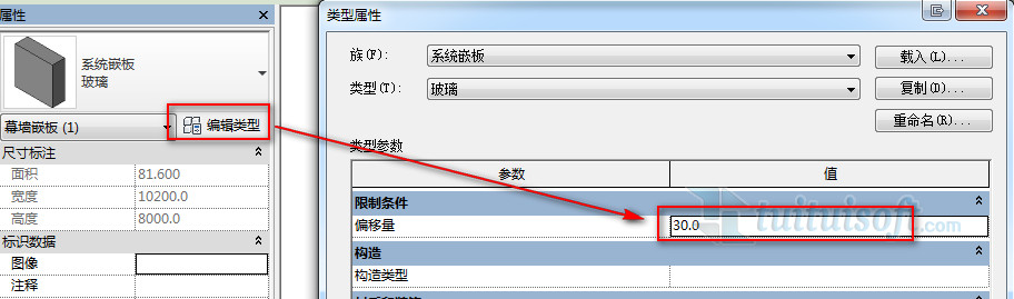 但一般用系统自带的幕墙绘制,没有自定义嵌板而产生的偏移问题更趋向于在参数里设置了一定的值!