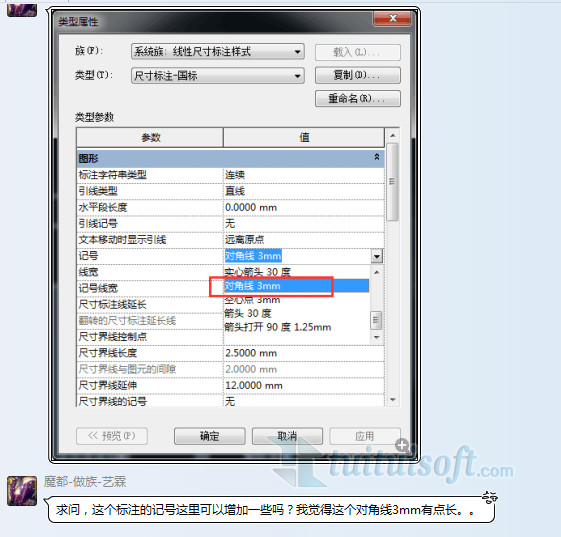 Revit如何修改标注样式里的对角线大小或尺寸?