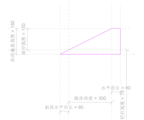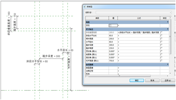 2、转到左立面视图中,创建如下几条参照平面,添加参数,并对斜段垂直高度添加一个公式:(斜段水平加长+踏步深度)*踏步高度/踏步深度。