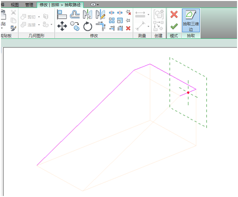 5、在楼梯转角族中切换到三维视图中,使用放样命令,并采用拾取路径的命令,路径如下图: