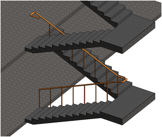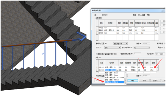 8、选择栏杆扶手→放置在主体上,这是选择900mm圆管,放置在楼梯上,并将内侧重叠的栏杆删除。完成后效果图如下: