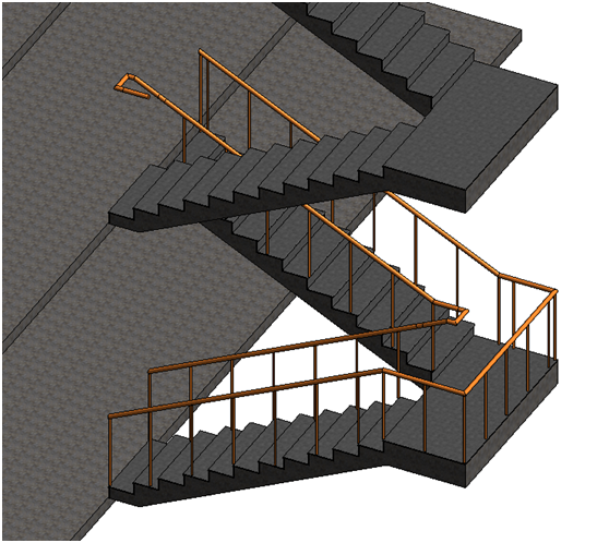 在REVIT中,楼梯栏杆转角扶手是存在一些问题的,并不是处理的那么完美,如下图所示,这时候就需要我们用一些手段来处理这些问题,虽然这些方法并不能解决所有问题,但是希望能提供给你们一种解决问题的思路。