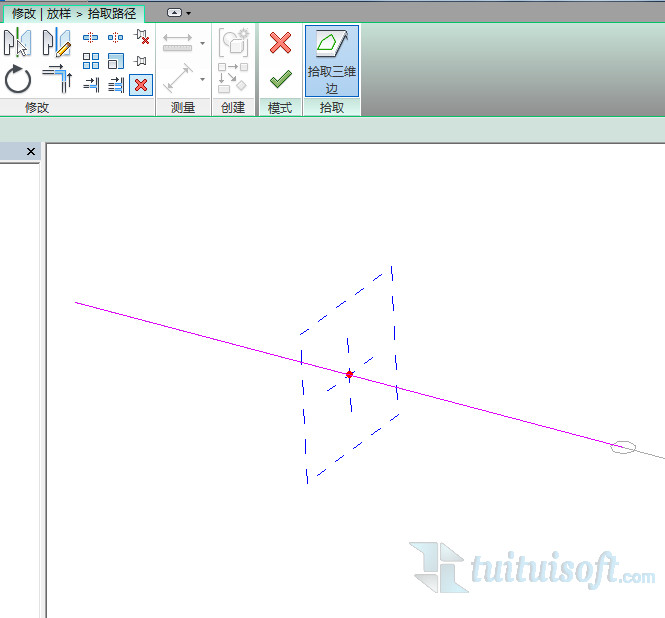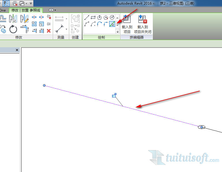 2、设置参照平面为工作平面并转到三维视图中,在创建选项卡中选择参照线,用拾取线的方法拾取刚才绘制的参照平面。