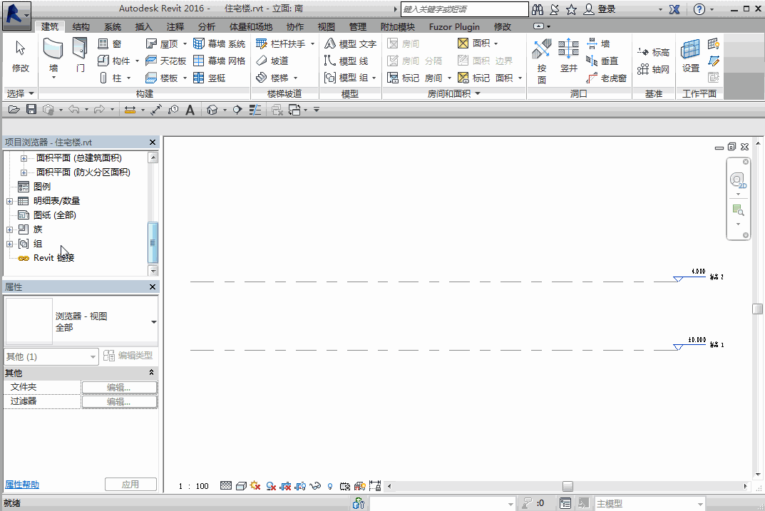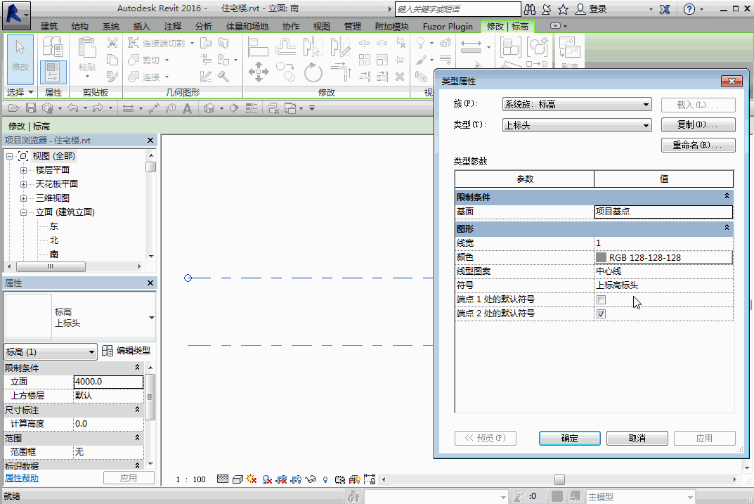 3.重新打开南立面视图,选择标高1,打开编辑类型对话框,在图形中单击符号选项,在产生的下拉列表中找到新建的族并选定,确定之后即新建成无名称的标高标头。