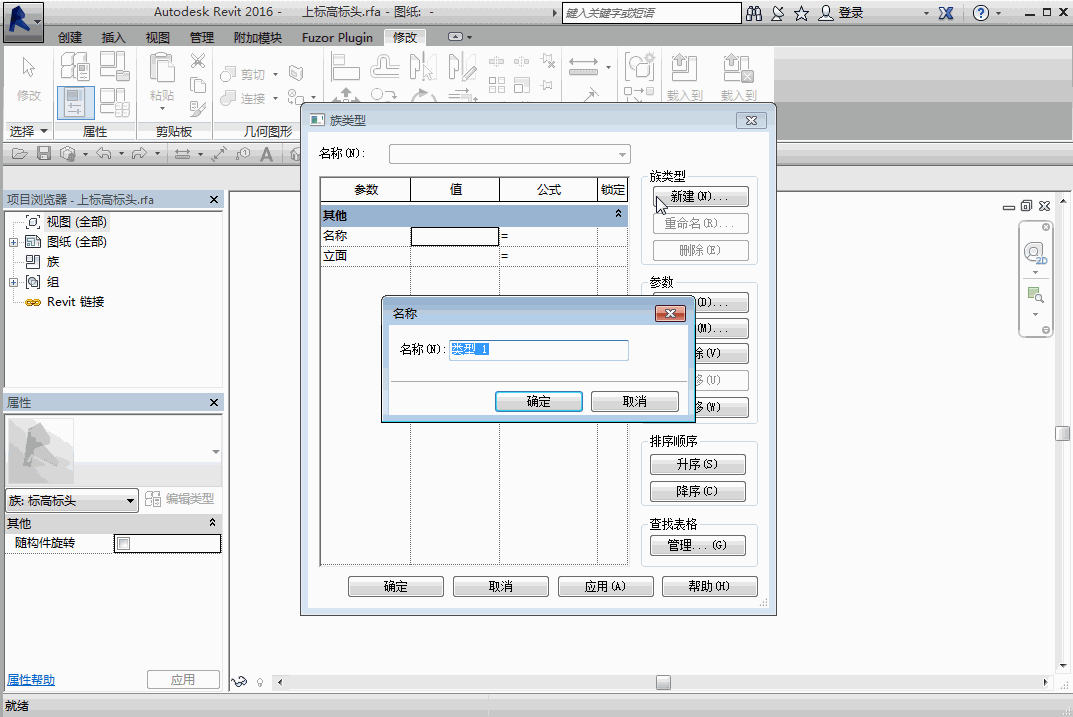 2. 打开标头图案后先选择另存为,为其重命名。删除标高右侧的名称方块并保存,选择工具栏中的族类型选项,点击新建选项,输入族名称,在族编辑器中选择载入到项目中选项。