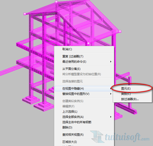 如何临时隐藏图元呢?选择需要隐藏的图元,点击视图控制栏中的眼镜图标,选择隐藏图元(快捷键hh)