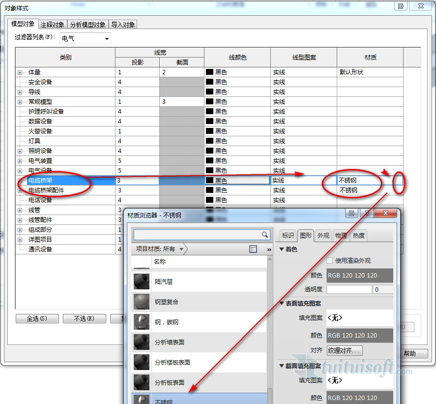 如何在Revit如何给电缆桥架设置材质?