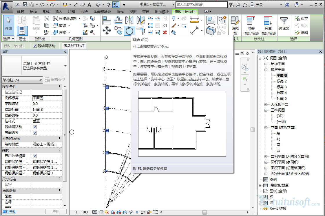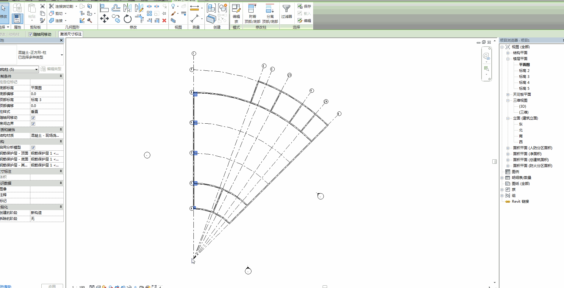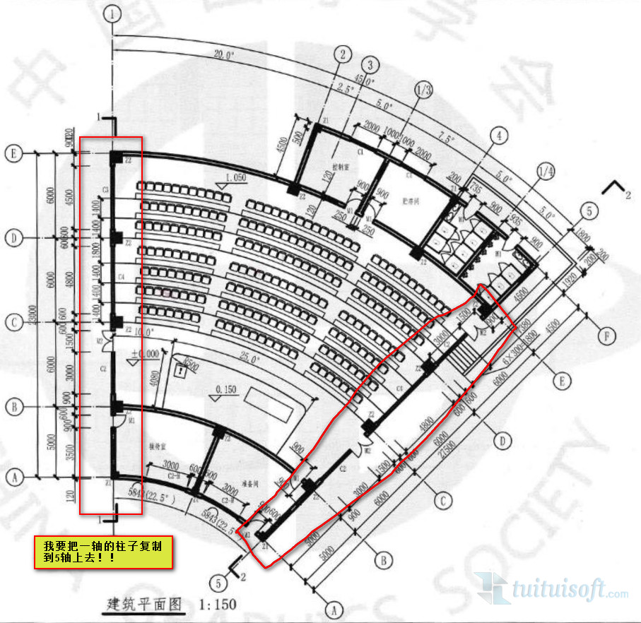 我要做的就是呢就是画出5轴的柱子(截图软件居然不可以对框进行旋转,真是大Bug 啊,请忽略我画出来的弯弯扭扭的线),可是,我是谁啊,COCO啊,我这么懒肯定不愿意一个一个重新画啊(你肯定又要想了,直接用镜像不就行了,可是我笨啊,当时没想到啊)所以,就发现了旋转的奥秘咯!