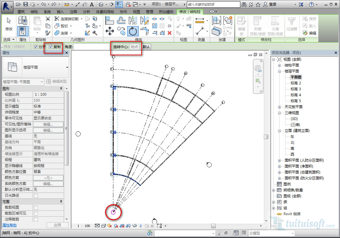 勾选复制,旋转中心:地点, 选中旋转中心。