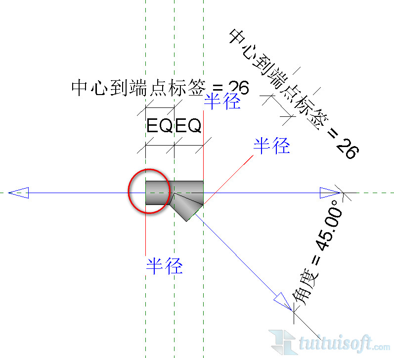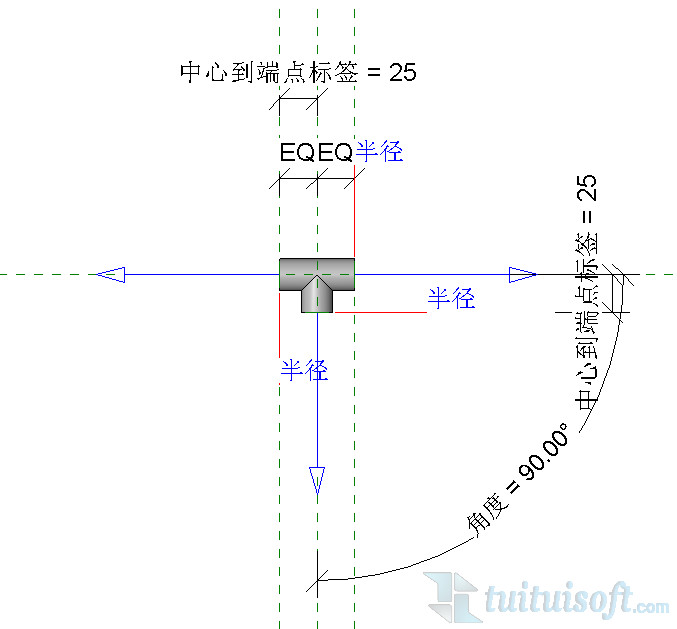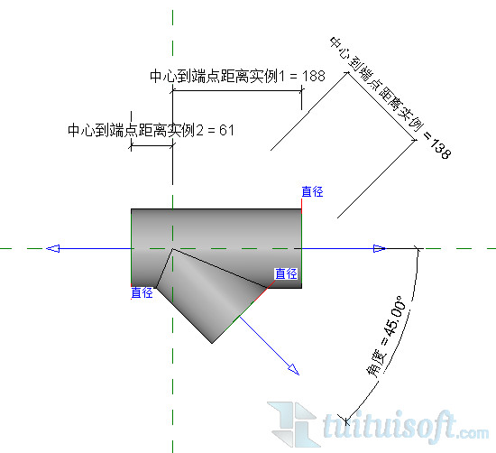 当角度等于90度时,主管上的两个距离都为相同的“中心到端点距离”