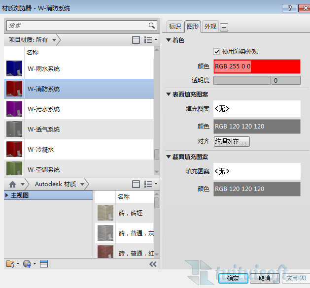 7、这里要注意的是,需要编辑“图形替换”,将线宽颜色改成和材质相同的颜色,不然的话当你缩小模型时会发现所有管道都会显示为绿色的。