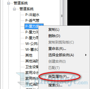 5、材质添加完之后就可以进行下一步操作了,在项目浏览器中找到“管道系统”,选择一个系统类型,右键进入类型属性面板