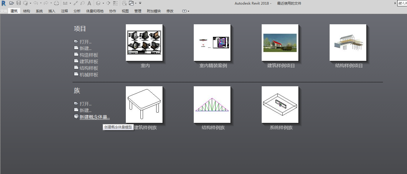 打开revit软件,我们可以在软件的开始页面找到新建概念体量