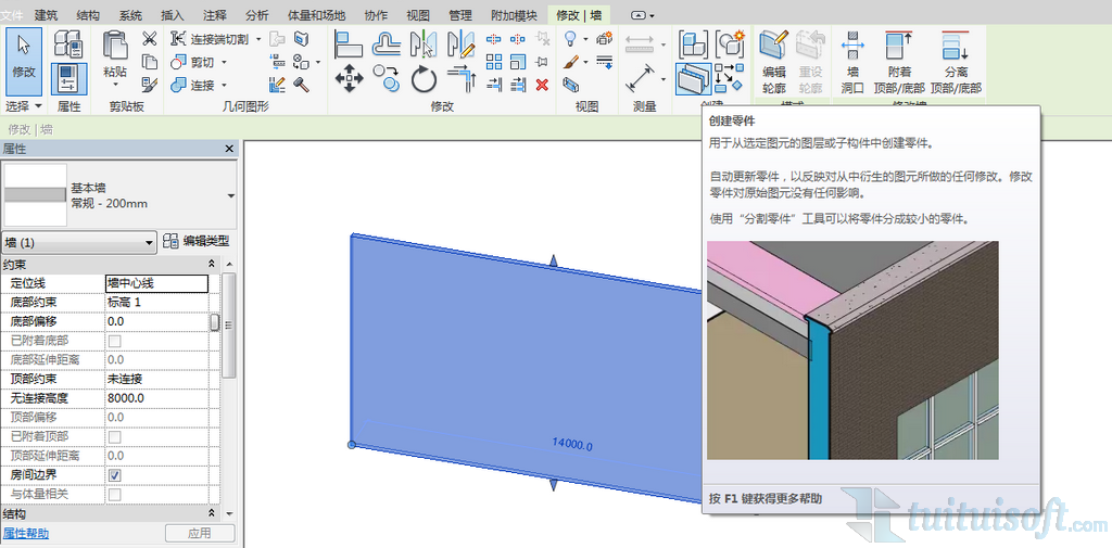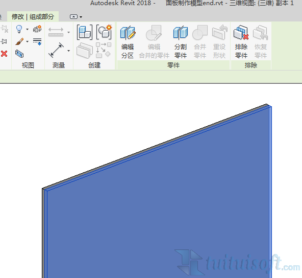 打开revit,在项目中创建一道墙体,然后切换到三维视图中,点击创建的墙体,上方的命令栏修改中有个创建零件的命令,使用这个命令,将我们的墙体转换成零件。