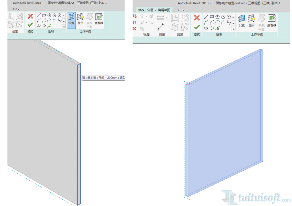 进入命令后,选择编辑草图,首先设置墙体的侧面作为我们的工作平面,将这道墙体分割成两片墙体,其中一片墙体的厚度就是凹凸的厚度;
