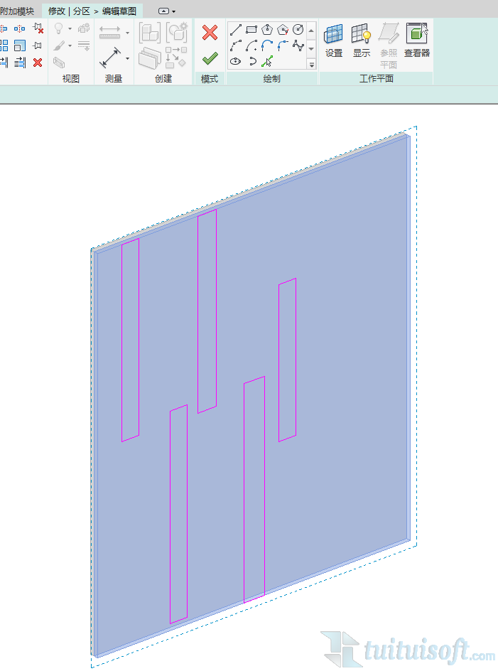 点击其中一片墙体,再次进行分割零件命令,编辑草图的时候,要把工作平面设为墙面,随后,我们就可以在墙体上把凹凸部位绘制出来