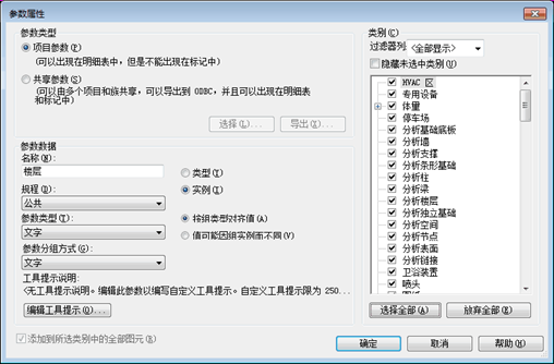 1、创建一个项目参数,参数名称可命名为“楼层”(记得将右边的类别全选!)