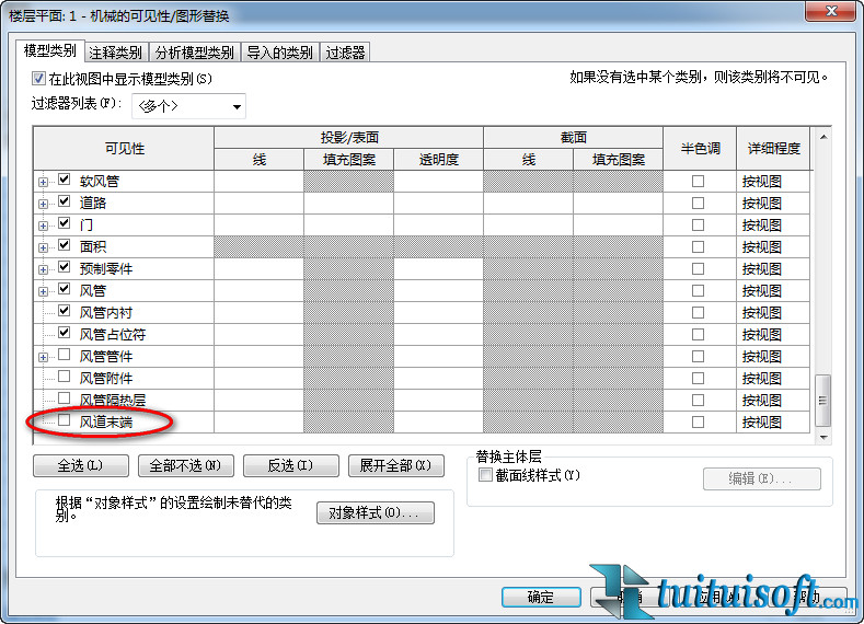 点击可见性/图形替换的编辑按钮,这时候我们发现风道末端的可见性并没有处于勾选状态,将它勾选之后就可以在视图中看见我们刚刚布置的散流器模型了。 (PS:在这之前我们要先知道散流器是属于风道末端的族内。当然全部勾选也是个简单粗暴的办法。)