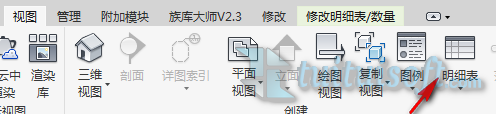 首先在视图工具栏中点击“明细表”下拉并选择“明细表/数量”: