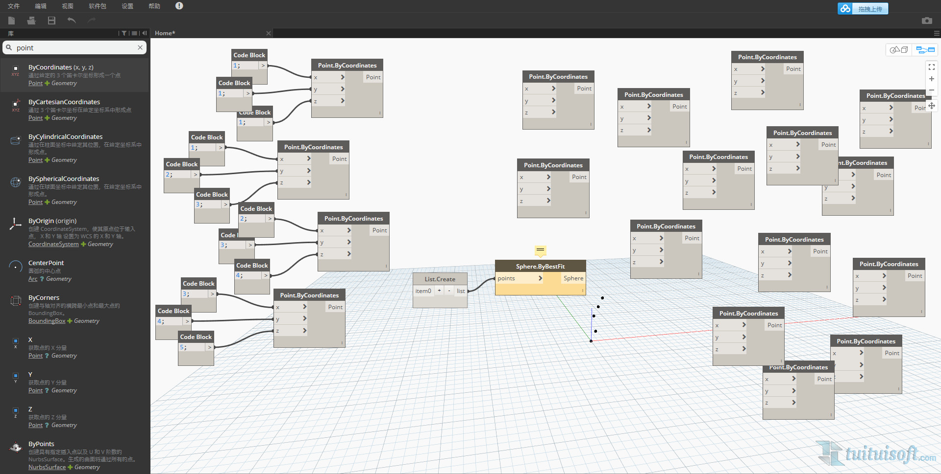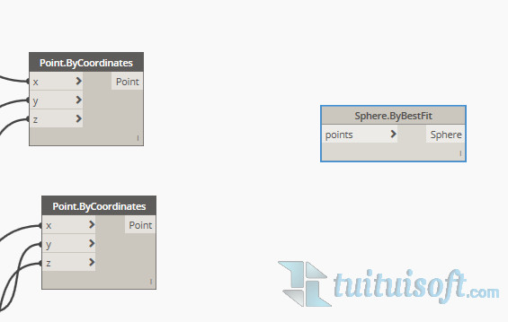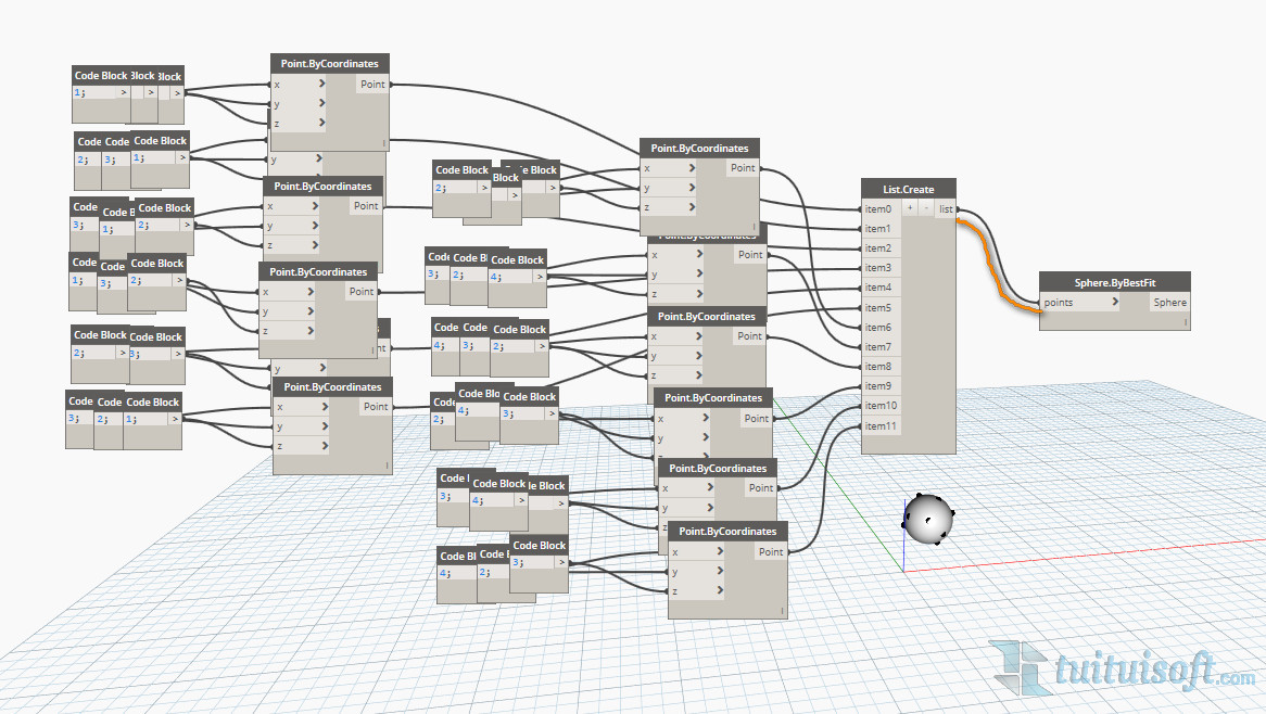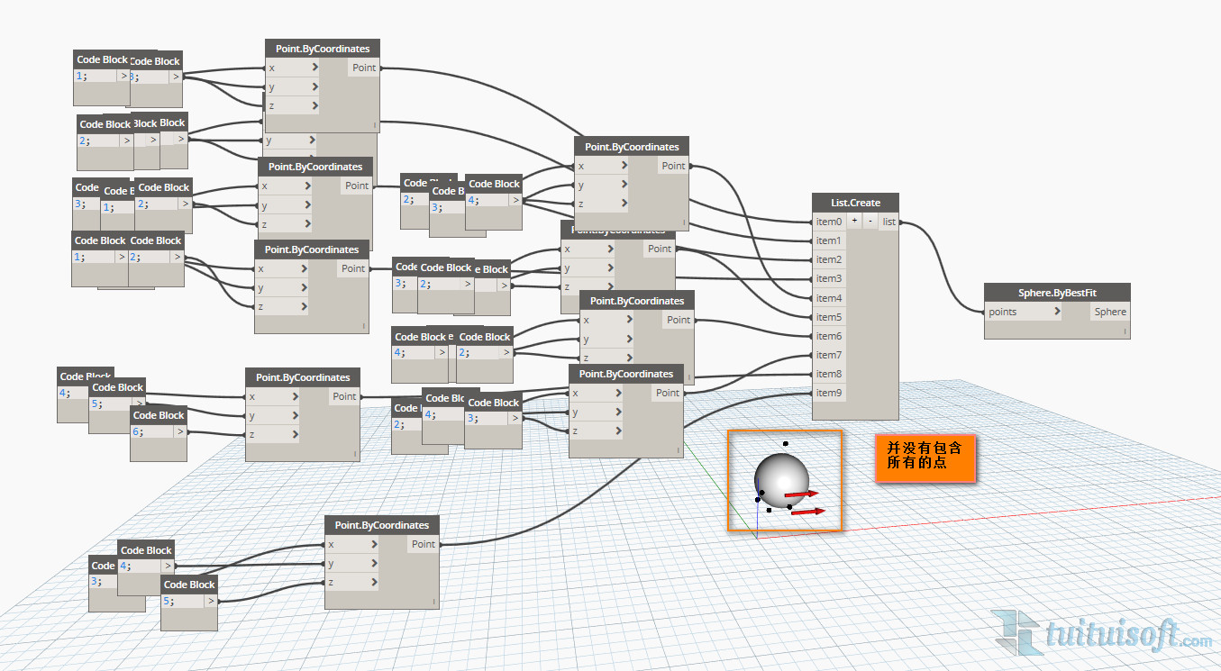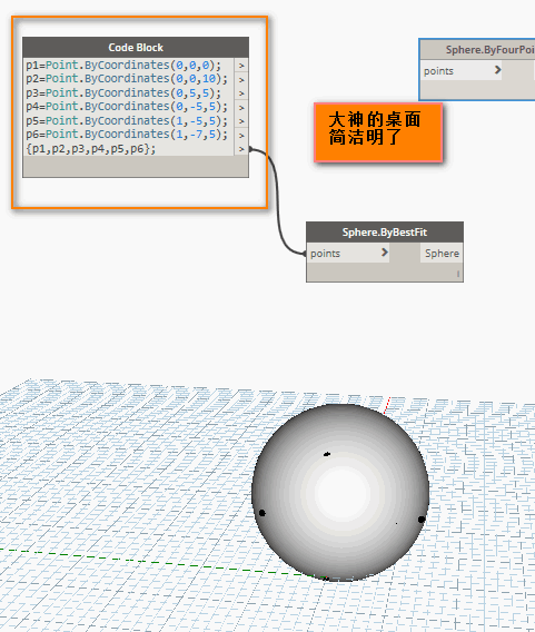 接着将他们连接到 List.Create 中转站,再将另一边连接到 Sphere.ByBestFit 结点的 Points,这样一个球体就生成啦。