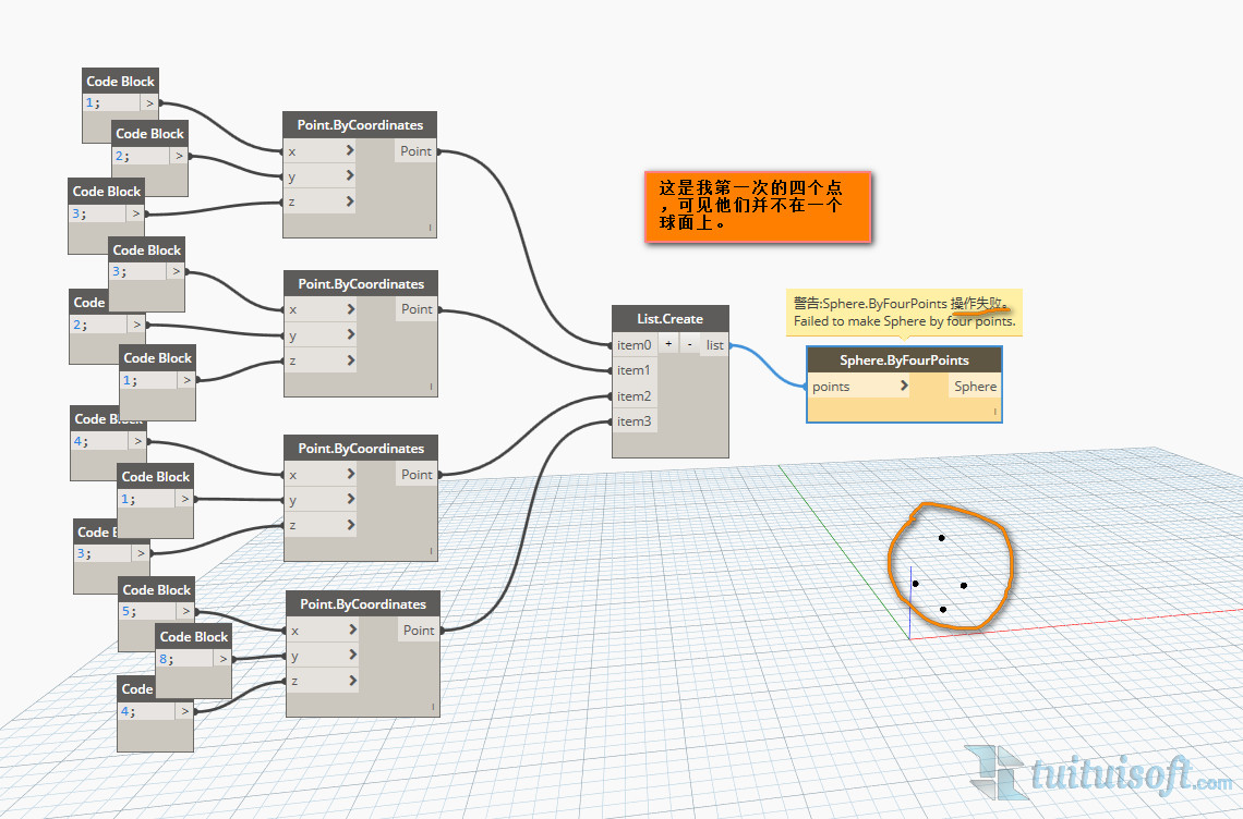 3.通过给定的四个球体表面的点创建实心球体(1,3的区别在于1是通过你给定的多个点创建出一个球体,这个球体的表面会穿过大部分给定的点,但不是全部。而3的话给定的四个点必须是已知球上的四个点,就是这四个点必须是在球体表面的,这样你才能生成出这个球)这句话很绕,但是希望你能看懂