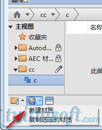 接着新建材质,在材质浏览器下方主视图里点击“小加号”下拉选择“新建材质”并命名。