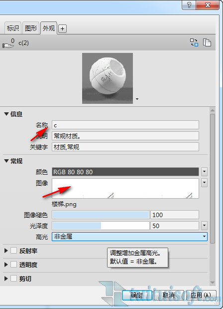设置新材质里的属性,在外观栏里的信息栏里给“材质名称”在常规栏里”添加贴图和颜色”: