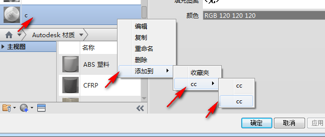如何把建好的新材质添加到自定义材质库里的类别呢?选择之前做好的材质右键“添加至”: