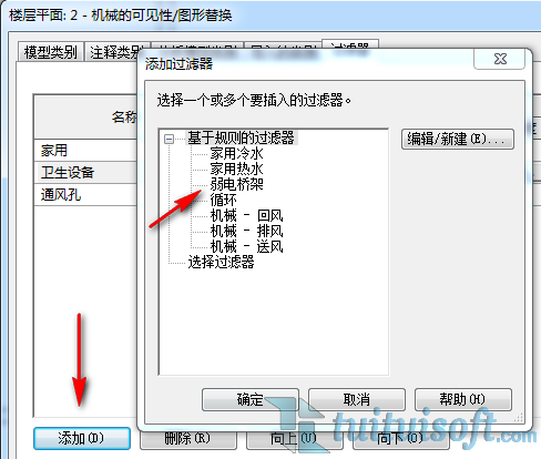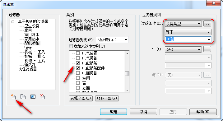 新建弱电桥架的过滤器,在过滤器列表中的隐藏未选中的类别里选择“电缆桥架、电缆桥架配件”在过滤条件了选择“设备类型”,在设备类型的下方选择“等于电信”。