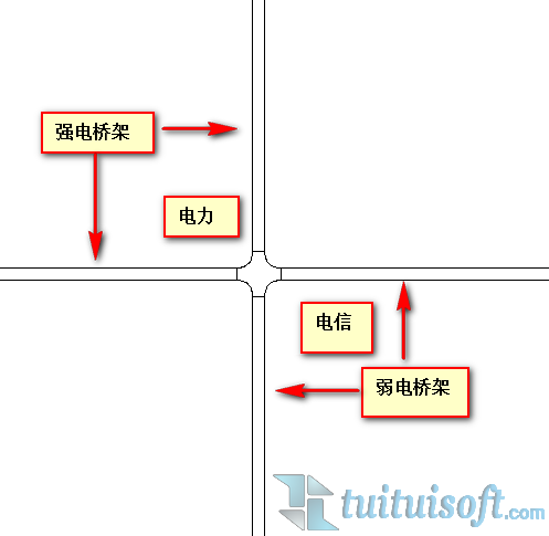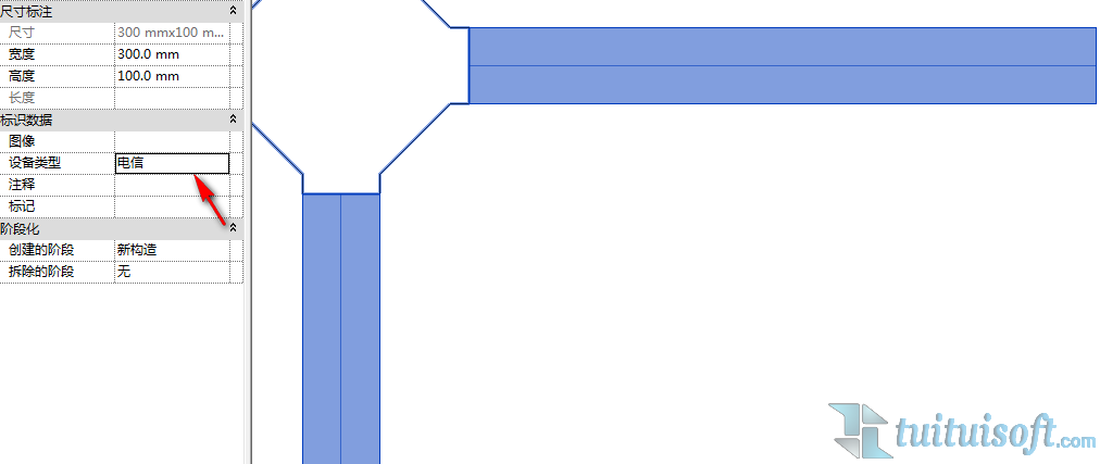 接着分别选择弱电桥架,在属性工具栏中的标识数据中的设备类型里选择相应的类型,在这里选择电信。同样的方法,强电桥架选择电力。