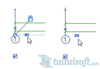 要控制不同视图中的轴网根据视图布置显示,可以利用轴网的3D与2D模式的切换。在项目中,轴网默认为3D模式,当单击轴网时,轴网边上会以蓝色小字提示,如图2所示,在3D模式下,对轴网所做的修改和调整会影响到所有视图。