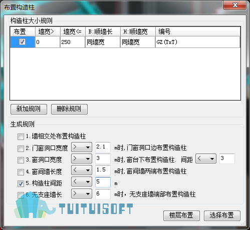 结合建筑规范的要求,研发的智能布置功能,加快建模的速度,目前可智能布置构造柱、圈梁、过梁、窗台。如按照规范要求,墙长超过5米时要布置构造柱,在智能布置窗口选择相应的条件规则后可自动布置构造柱。界面如下图所示: