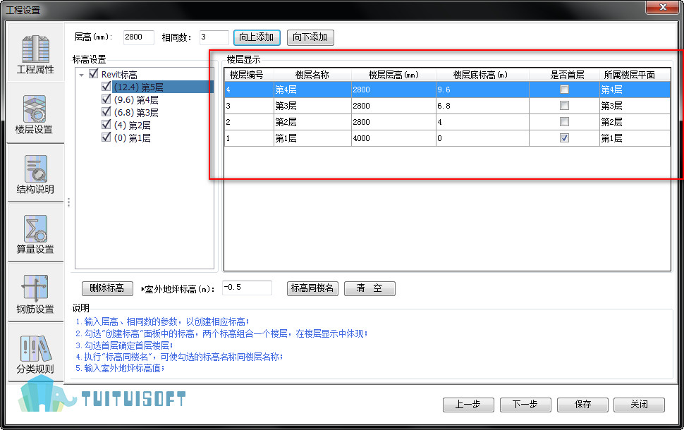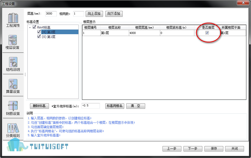 勾选第一层为“首层”根据图纸双击输入“楼层层高”