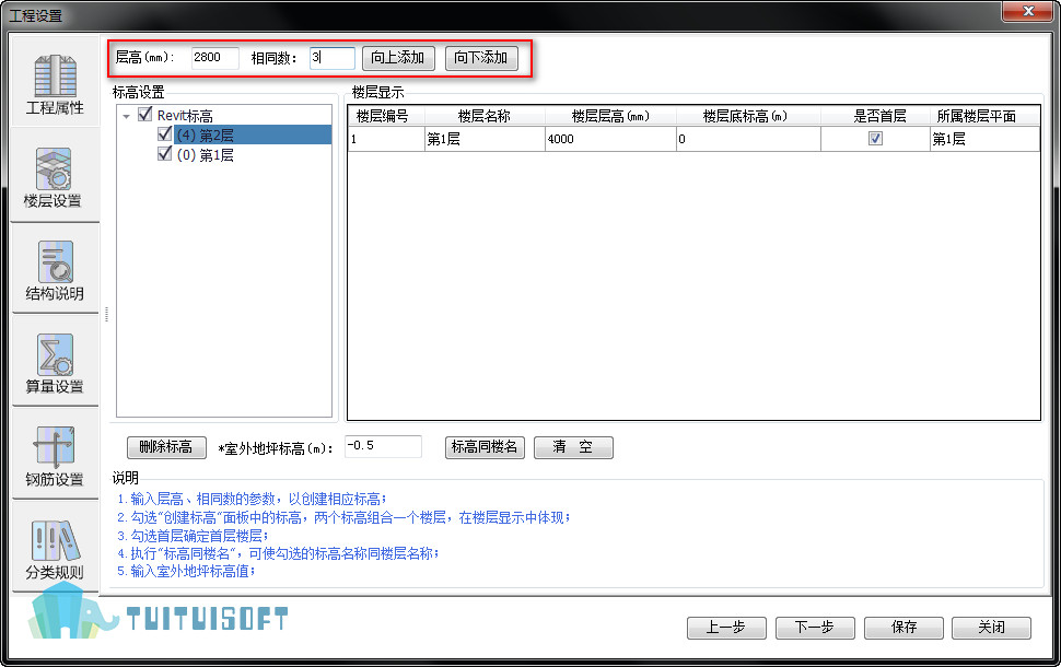 若要设置第二层层高,在“层高”处输入比如“2800”;相同数:1表示一层