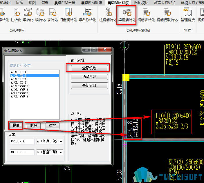 梁名称转化功能能够识别出梁的标注图层,能够识别出CAD图纸中的配筋图中梁的信息。如下图操作所示:
