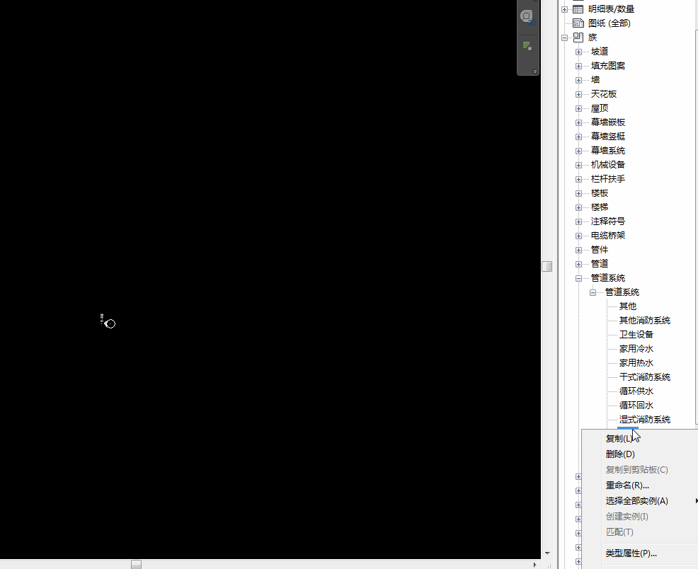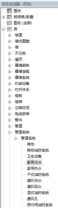 1.首先绘制管道前,我们需要到项目浏览器中打开族,找到管道系统。