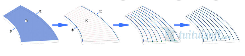 自由形式钢筋会在曲面分布集的第一根及最后一根之间插入。曲线跟随主体曲面几何图形并相对于主体保护层。首先,起始曲面 和主体曲面 的相交处会放置第一根钢筋。 接下来,结束曲面 与主体曲面的相交处会放置第二根钢筋。 最后,其余钢筋(如钢筋集布局指定)会在第一根 和最后一根钢筋 之间插入 。