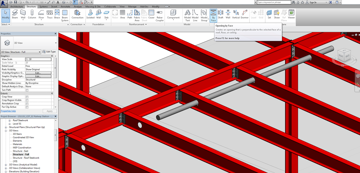 现有工作流程的问题:设计师在Autocad里面出设计图,深化单位在Autocad里面绘制深化设计图,比较先进的深化设计单位或者比较复杂的项目可能用详图设计软件重建3D模型。新的工作流程避免了以往不连续配合中的问题:详图工程师未正确理解设计意图导致节点深化错误;构件截面,长度,材质等搞错;结构设计图纸遗漏了建筑及机电设计师的解洞(例如下图);当然最棒的是大家在同一个模型上进行配合,详图工程师不必再另起炉灶,花费很大精力重建一个3D钢结构模型,只需集中精力完善设计中未明确部分。