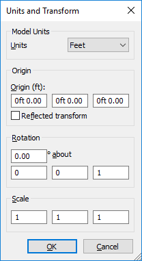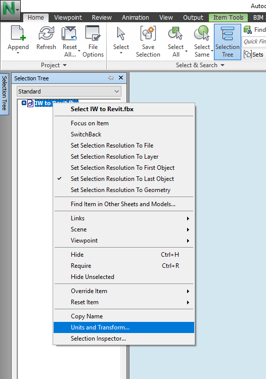 在 Navisworks 中打解 FBX 模型。Navisworks 模型的单位必须与从 InfraWorks 导出的 FBX 的单位匹配。要更改 Navisworks 中的单位,请从“选择树”中选择模型,右键单击该模型并选择“单位和变换”。确认 X、Y 和 Z 坐标与第 1 步中的坐标相同。