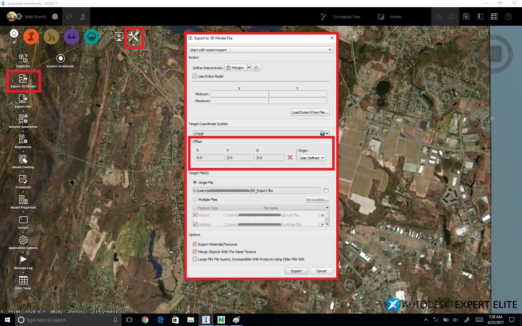 首先,将部分或整个 InfraWorks 模型导出为三维模型。单击“设置和实用工具”>“导出三维模型”。要使模型保持其地理位置,在导出为 FBX 格式之前,必须将用户定义的偏移设置为 0,0,0。