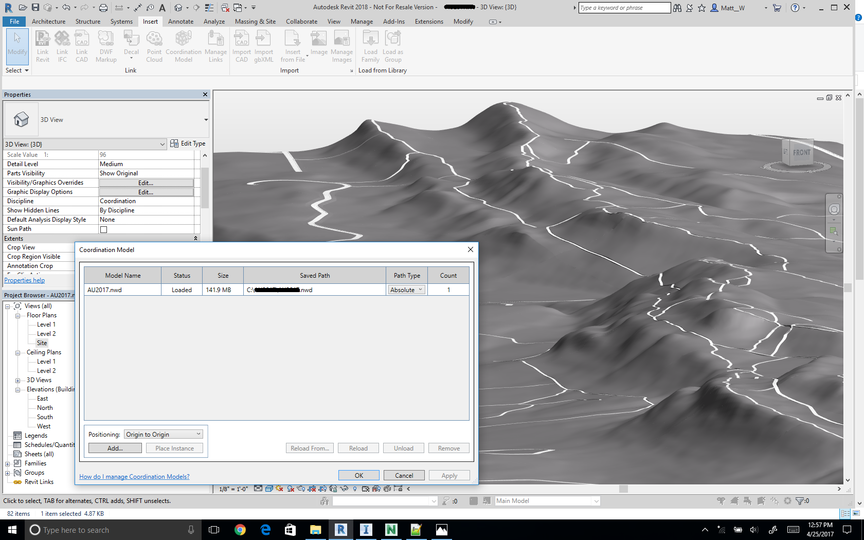 通过获取场地平面 DWG 的坐标(其坐标系与 InfraWorks 模型的坐标系相同),对 Revit 模型进行地理定位。确保场地平面 DWG 和 InfraWorks 模型具有相同坐标系的一个好方法是,直接在 Civil 3D 中打解 InfraWorks 模型。