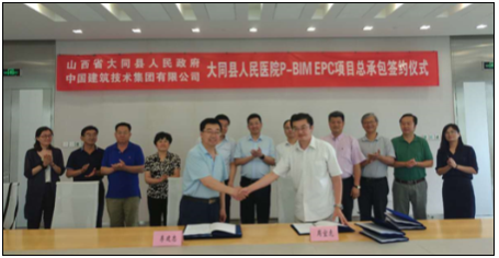 2017年7月5日,中国建筑技术集团有限公司与山西省大同县人民政府在北京签订大同县人民医院P-BIM EPC项目总承包合同。大同县人民政府周聚德县长、大同县人民医院李建忠院长、中国初级卫生保健基金会中西部扶贫工作办公室狄森主任、中国建筑技术集团有限公司赵伟总裁等出席签约仪式。