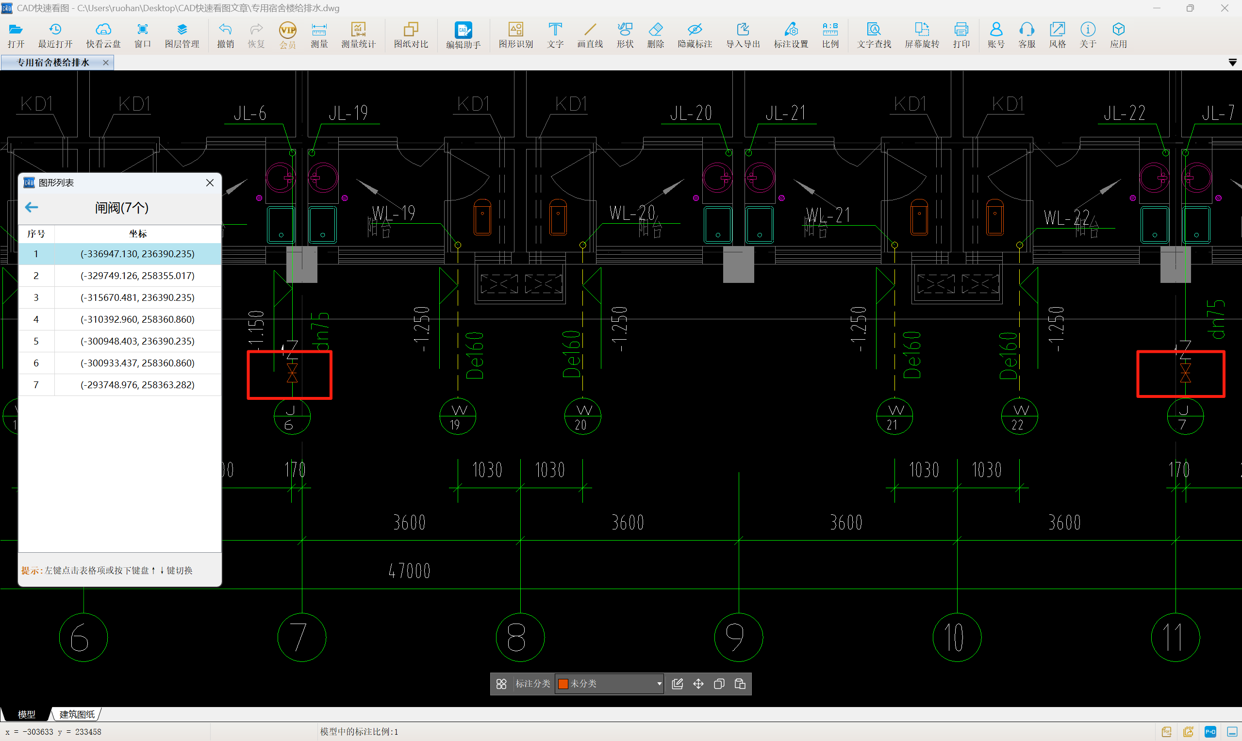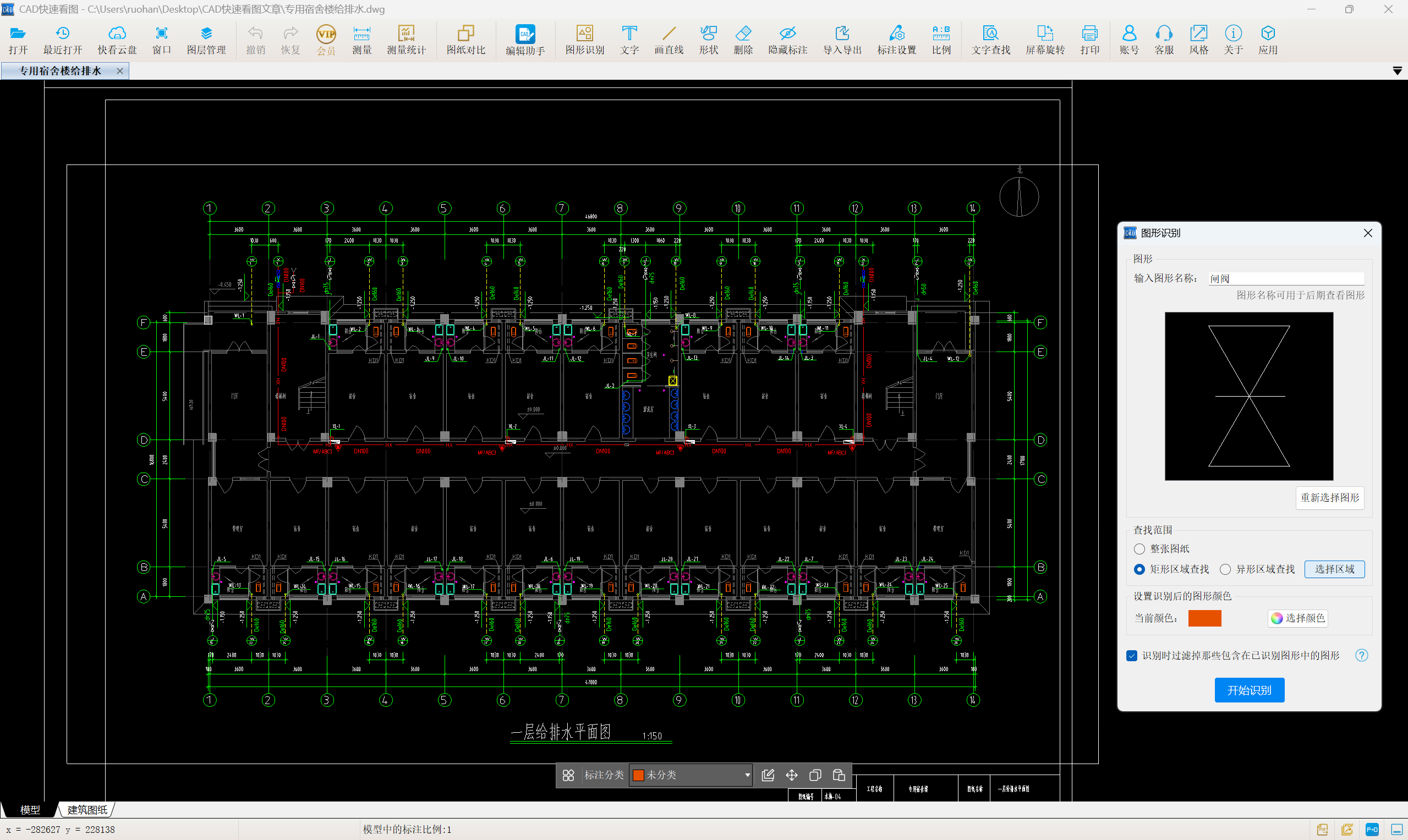 查找范围选择矩形区域查找,点击选择区域,框选一层平面图,最后点击开始识别,软件识别得到7个图形亮显(变红),可得到闸阀数量为:7。