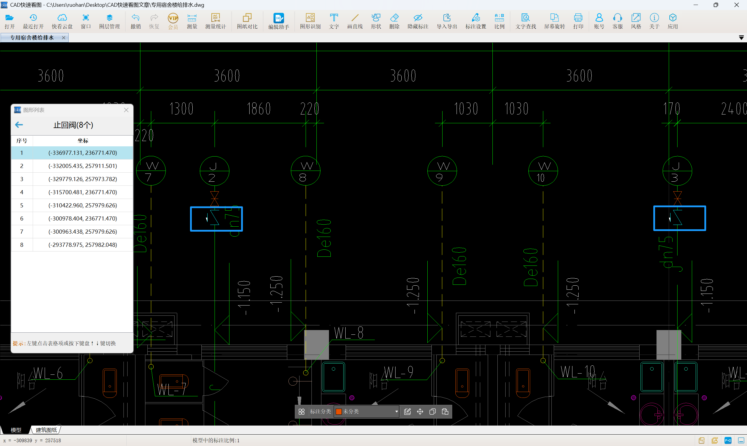 采用同样的方法,利用【图形识别】功能,得到止回阀的个数为8。其中属于消防系统数量为1,不列入工程量统计中;dn75数量为6,dn50数量为1。