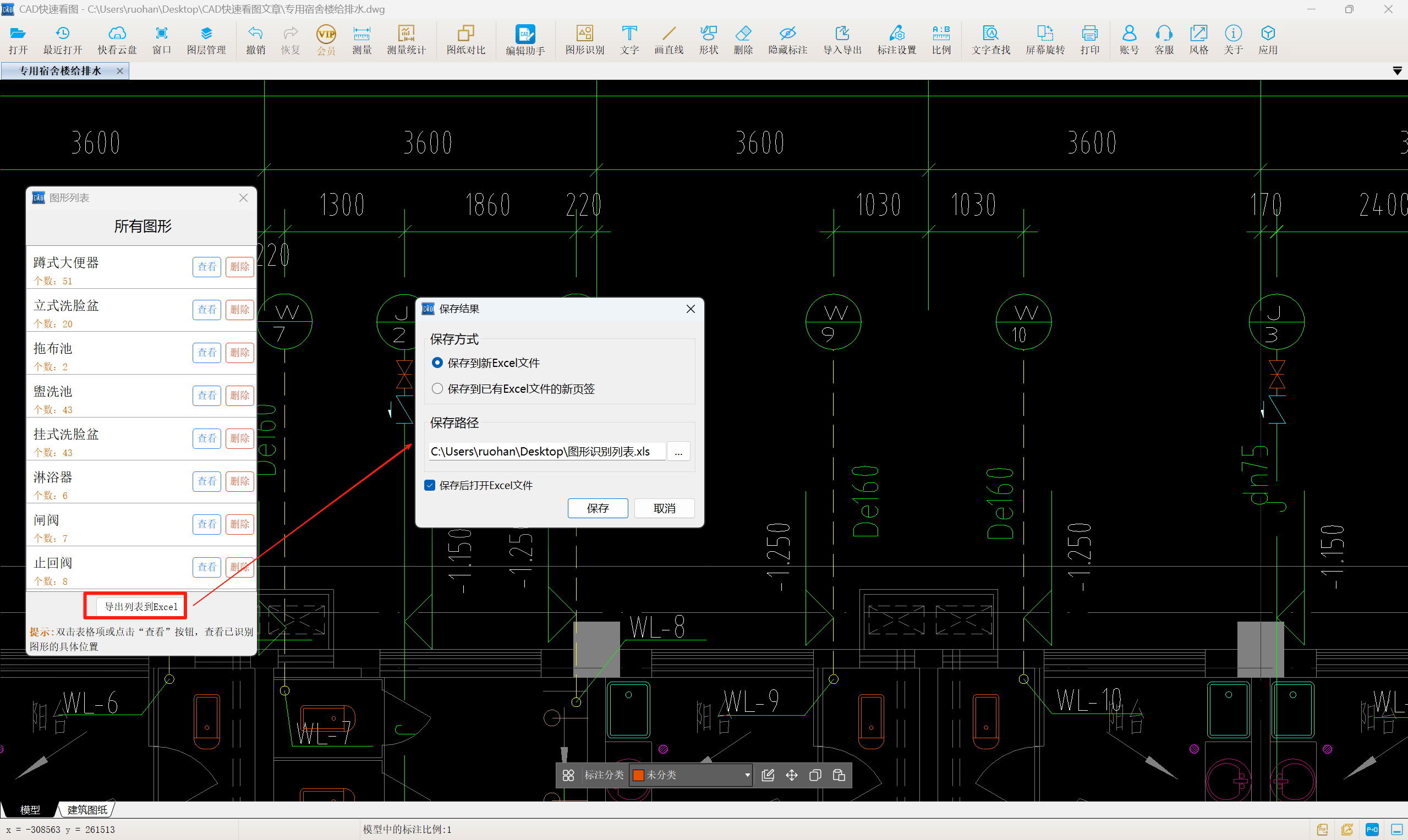 还可以通过图形识别-查看已识别图形列表,软件弹出图形列表,可以清楚查看各管道附件个数,还可以导出列表到EXCEL。