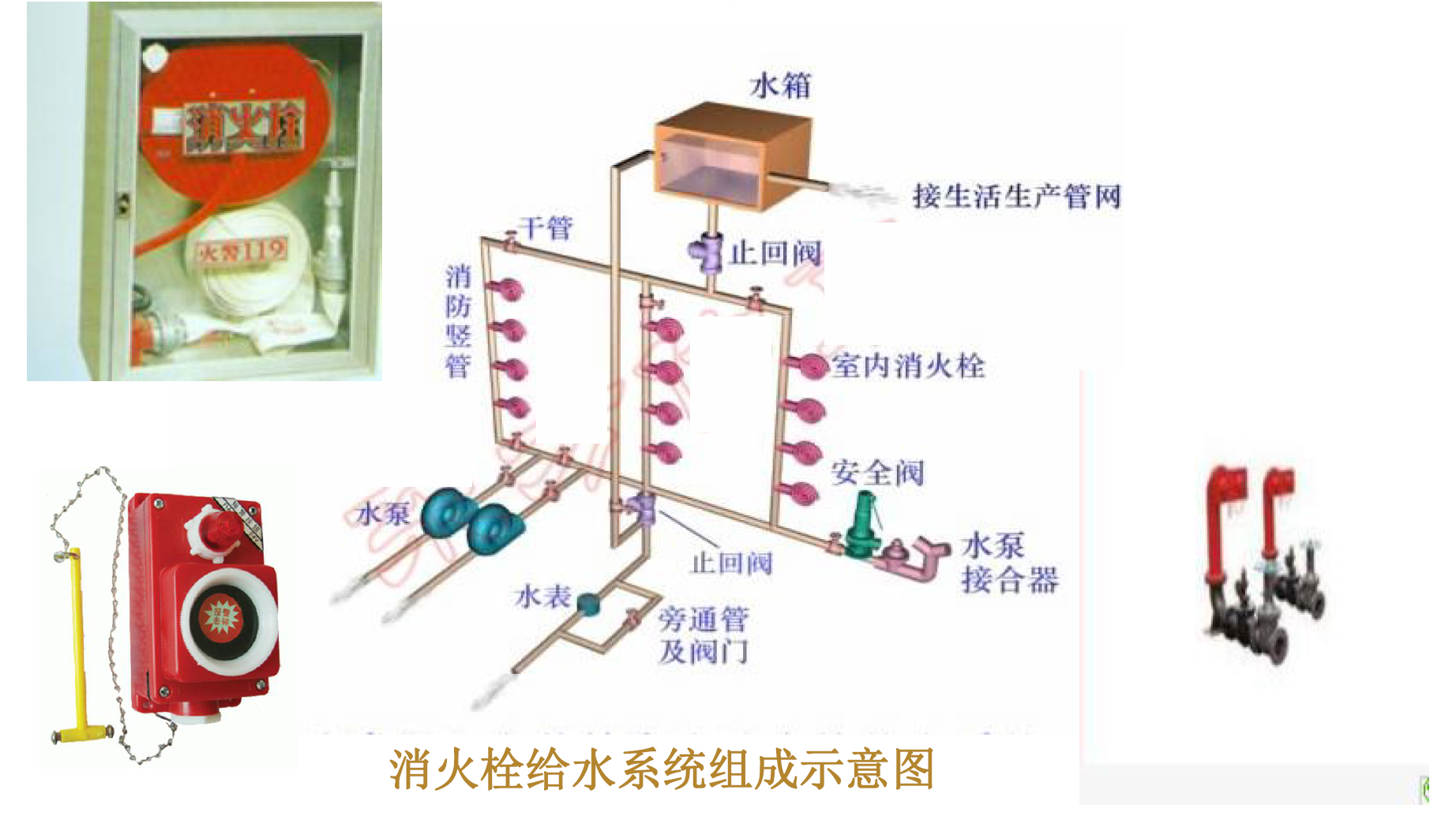 室内消火栓是扑救建筑物内火灾的主要设施。室内消火栓灭火系统主要由消火栓、水带和水枪组成。