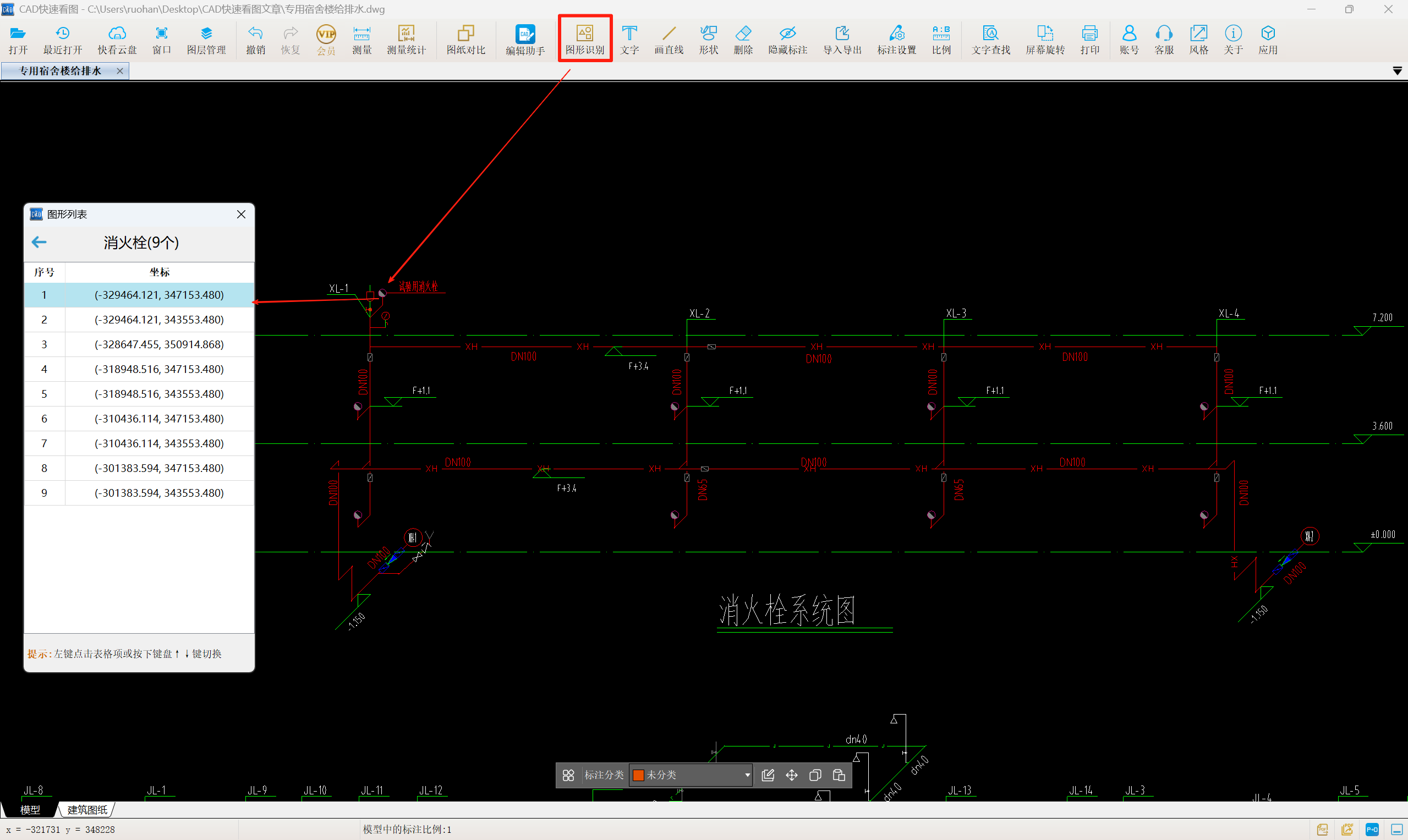 消防设备-水灭火系统的消火栓工程量可以通过CAD快速看图的【图形识别】功能轻松识别,让你工程计算效率提升