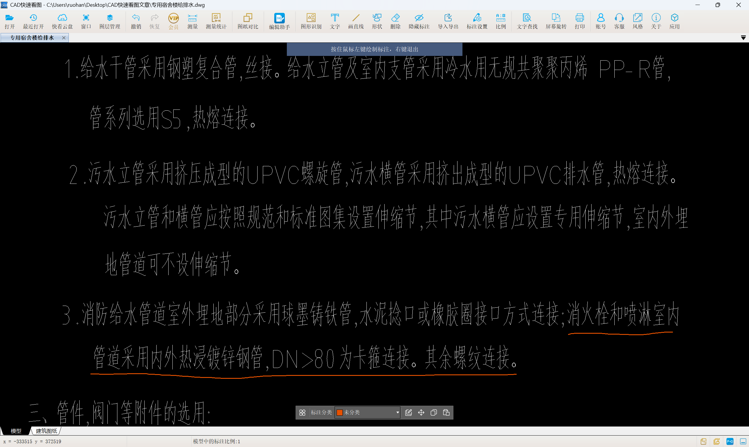 1.明确材质、连接方式:从设计说明中找到关于消火栓管道材料描述,消火栓管道采用内外热浸镀锌钢管,DN>80为卡箍链接,其余螺纹连接。