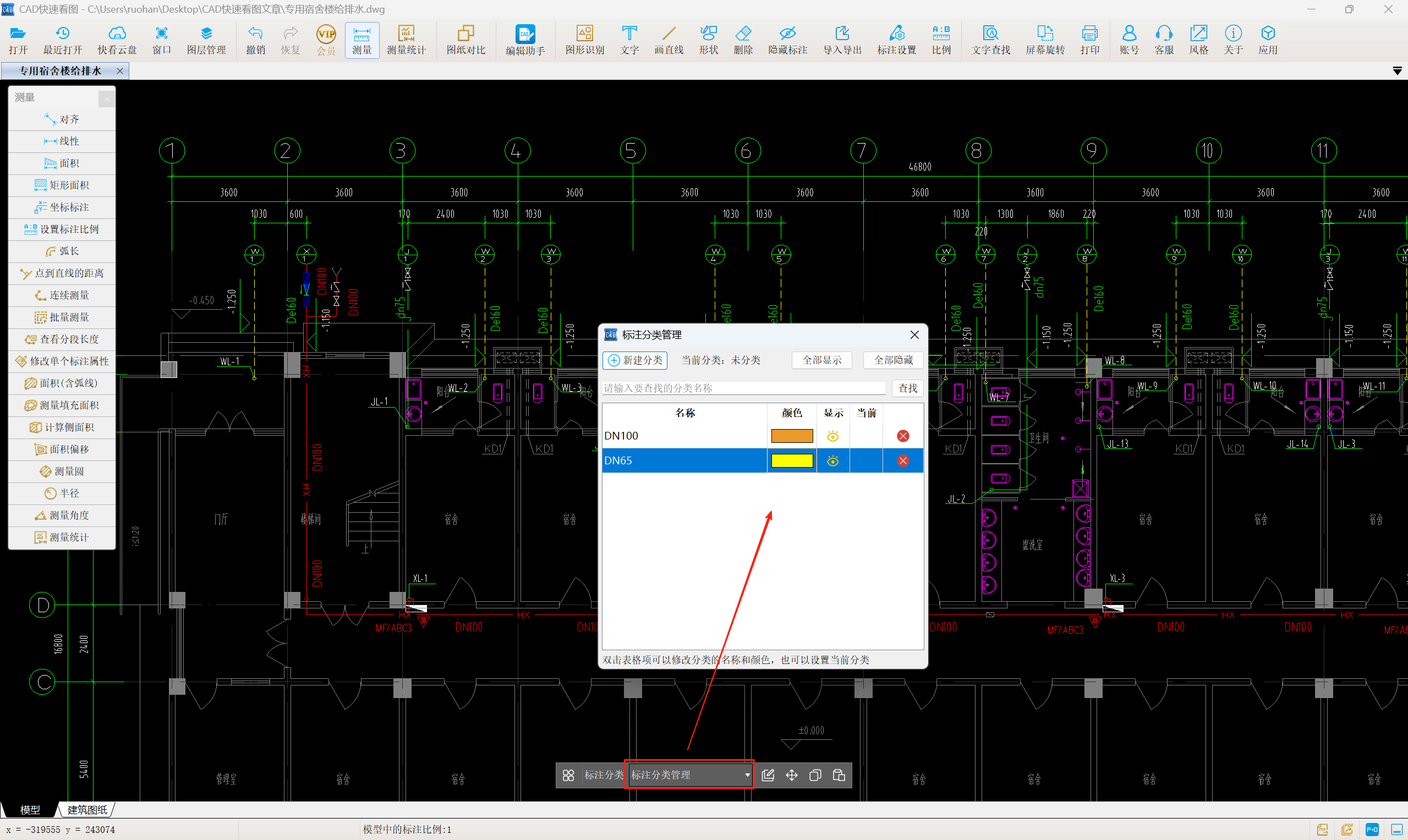 第一步在【标注分类管理】里新建该两种分类,选择适当的颜色。第二步在分类下拉选择栏里选择DN100。